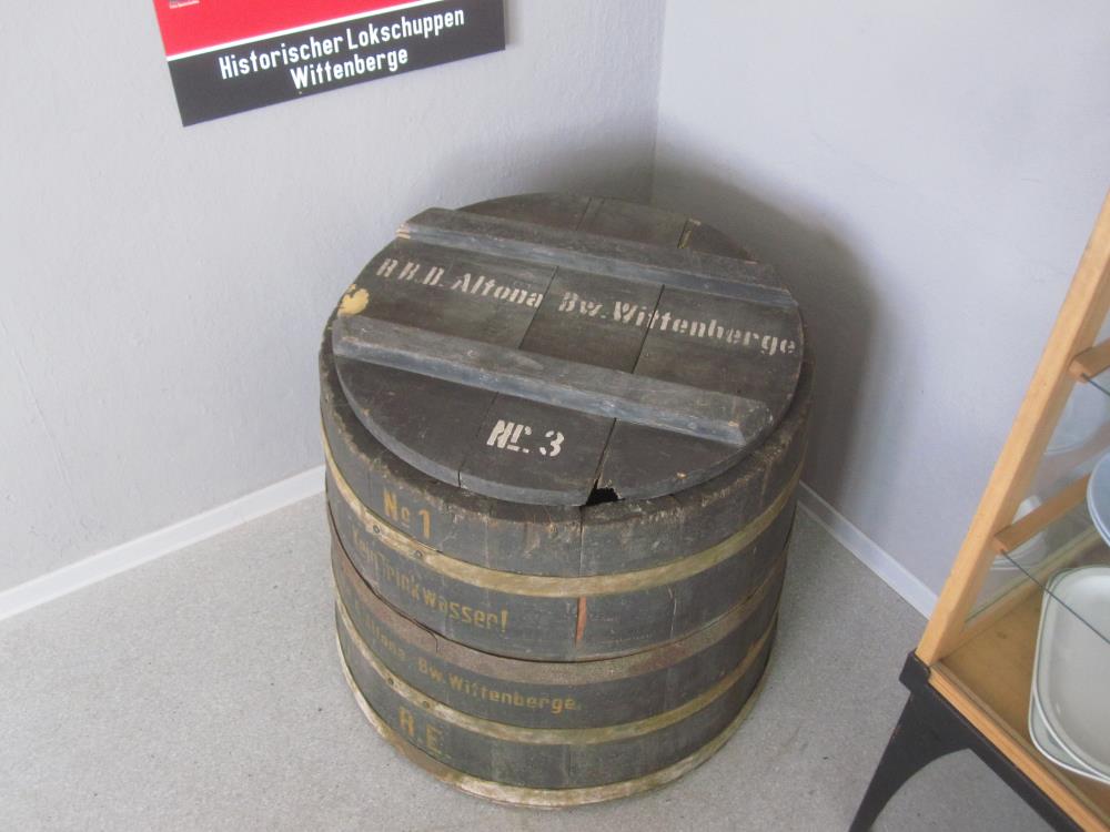 In one corner of the exhibition room, there is an old rainwater barrel