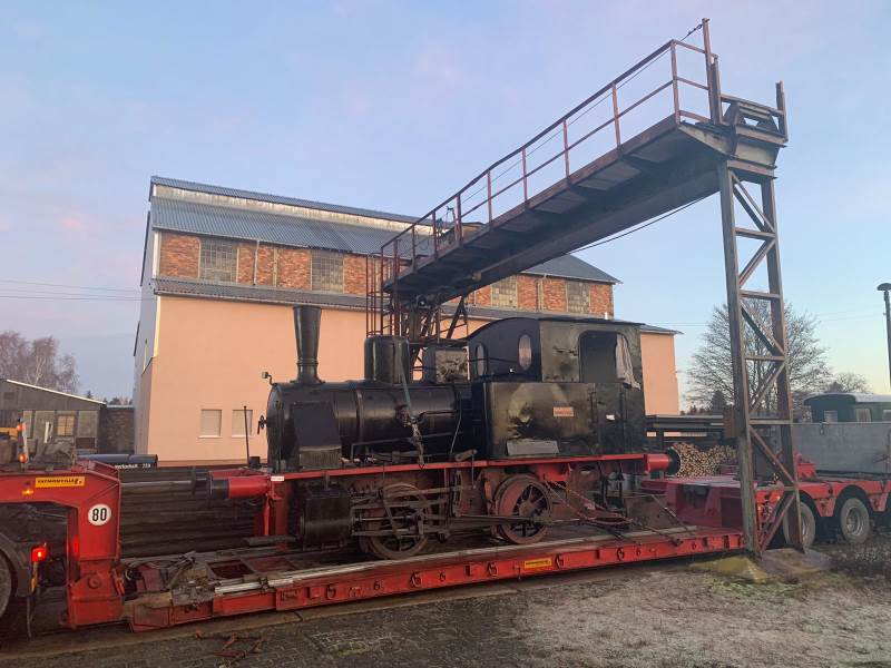 At the beginning of April, we reported that the steam locomotive originally built by Orenstein & Koppel for Karlsruhe gasworks has found its way into our museum. The following pictures show it after being loaded onto a low loader on its way to our museum and after unloading in front of our locomotive shed.