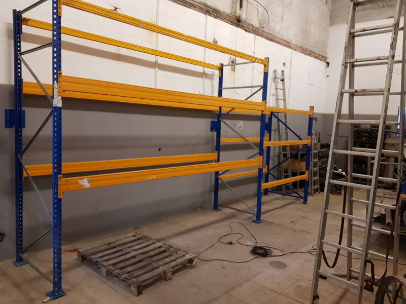 Our new shelving system is also making progress. It is now assembled and provisionally aligned. The next step will be to anchor it to the floor and the wall and then it will be ready for use. You may wonder why there are no shelves visible. Simple answer: It is designed to be used to lift pallets into it with a forklift truck. These will then stand on the yellow crossbars.