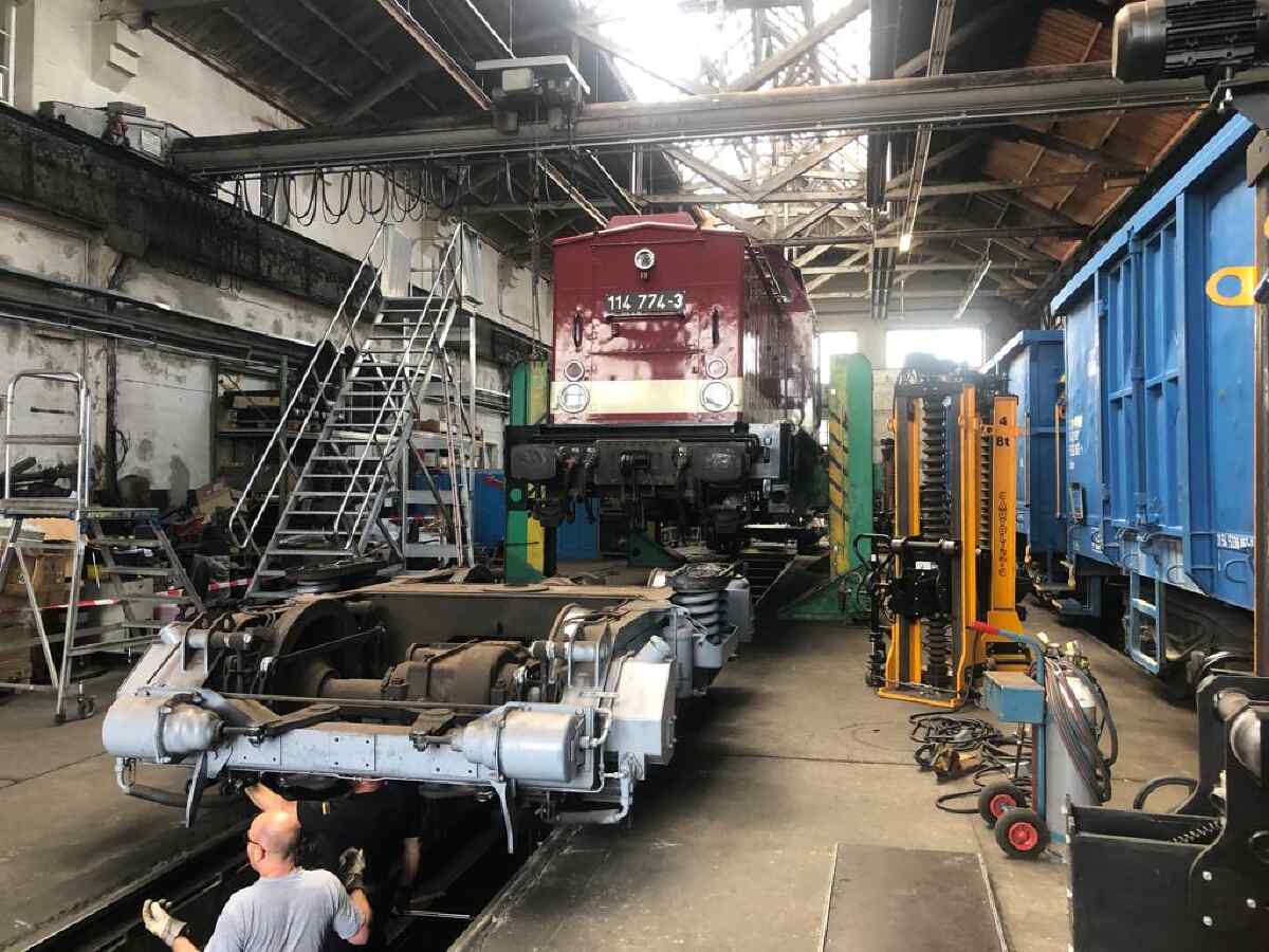 Today a small special report about the running gear inspection on our diesel locomotive of the class V100, which bears the road number 114 774-3. As already reported in the last newsletter, the locomotive is now undergoing this inspection in order to be allowed to run freely on the rail network in Germany. For this purpose, the locomotive's running gear has to be checked and repaired if necessary. On Saturday, the first major step was taken and the locomotive body was separated from the two bogies. To do this, the locomotive body was lifted by means of a lifting device and the two bogies were moved out.