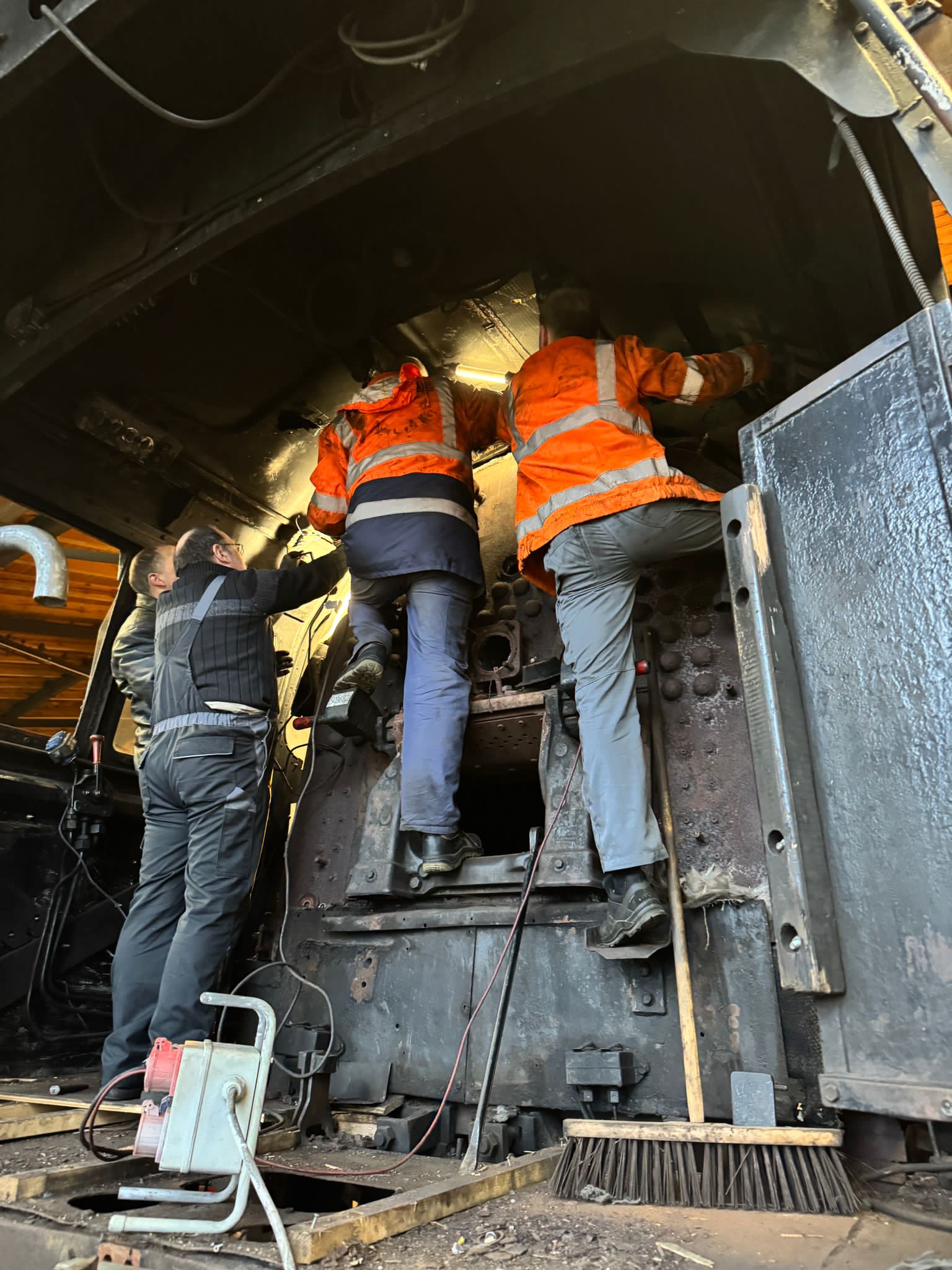 Bevor die Saison losgeht, haben wir ordentliche Fortschritte bei unserer Dampflok 50 3682 erzielt, die sich gerade in der Demontage befindet, damit sie einen neuen Kessel erhalten kann. Vorher muss allerdings noch das Führerhaus abgenommen werden, was gerade die Hauptaufgabe ist. Man glaubt gar nicht, wie viele Schrauben und Verbindungen zu lösen sind, damit das Führerhaus vom Rahmen und vom bisherigen Kessel getrennt werden kann. Etliche Schrauben waren dabei nicht mehr zu lösen. Also war der Schweißbrenner im Dauereinsatz, um sie durchzutrennen. Die angefügten Bilder zeigen den Einsatz der Kollegen.