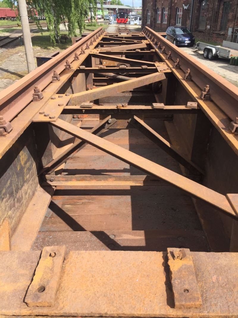 We have already reported elsewhere that the turntable in front of former loco shed 1 was scrapped at the end of the 1990s and the turntable pit filled in. Since it is the long-term goal of the society to reinstall this facility, the first steps have already been taken. Thus we were able to acquire a turntable deck from Parchim, which is to be installed in the turntable pit of locomotive shed 1, which can be reopened as it is the right length. Now the deck has been cleaned of old paint and rust by a specialist company using a high-pressure water jet and primed. The parts can now be examined, although we do not foresee any major difficulties. The pictures show the cleaning work on 23.5.2017.