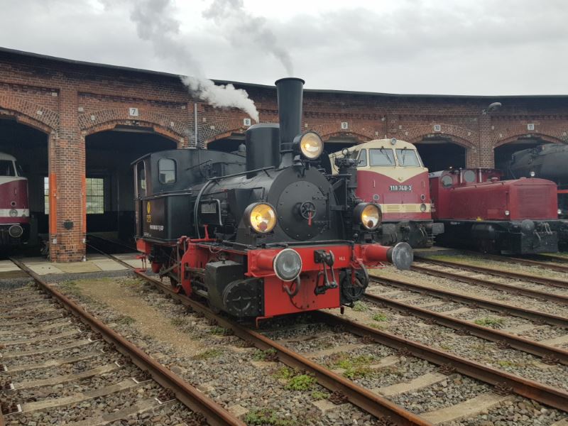 There was a rather unusual picture to be seen in Wittenberge today. When does a steam locomotive roll through the town? The mystery is quickly solved, because today the steam locomotive "Pritzwalk" was delivered by low-loader to the historical locomotive shed Wittenberge. The locomotive came piggyback from Meyenburg to take part in the museum's anniversary event on October 12 and 13, 2019. It will then be in steam and take turns with the museum's other locomotives in offering the popular driver's cab rides and will certainly also be given a place of honour in the vehicle parade, which will take place around 2 p.m. on the days of the event. The small locomotive was built in 1912 by Henschel in Kassel as a shunting locomotive for a gasworks in Frankfurt. It was in service there until 1968 and was then displayed for decades as a monument, most recently in front of a model railway shop in Wuppertal. In 1999, it was acquired by the Prignitzer Eisenbahn, forerunner of today's Eisenbahngesellschaft Potsdam, and was recently returned to working order. The club members are most pleased to have the locomotive as a guest on the occasion of the club's anniversary. The following pictures show the locomotive still on the special low-loader and after unloading under tow by a diesel locomotive on the turntable at the museum.