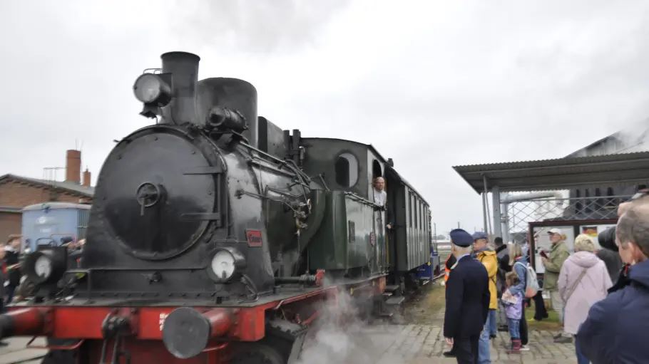 Bereits vor dem Lokschuppen-Gelände sind die Eisenbahnfans in Aktion. Mit Kameras und Smartphones ausgerüstet fotografieren sie die Dampflok der Baureihe 50.35, die gerade vor dem Stellwerksgebäude einfährt. „Mit ihr können die Besucher eine große Führerstandsfahrt unternehmen“, so Mangelsdorf.