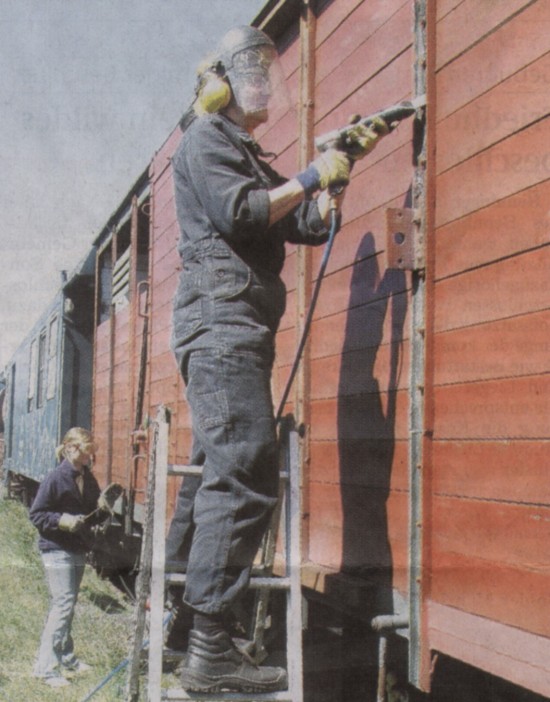 Conny Förster (vorn) und Andrea Schulz aus Lüdersdorf vom Historische Eisenbahnen West e.V. restaurieren in Salzwedel einen Güterwaggon.