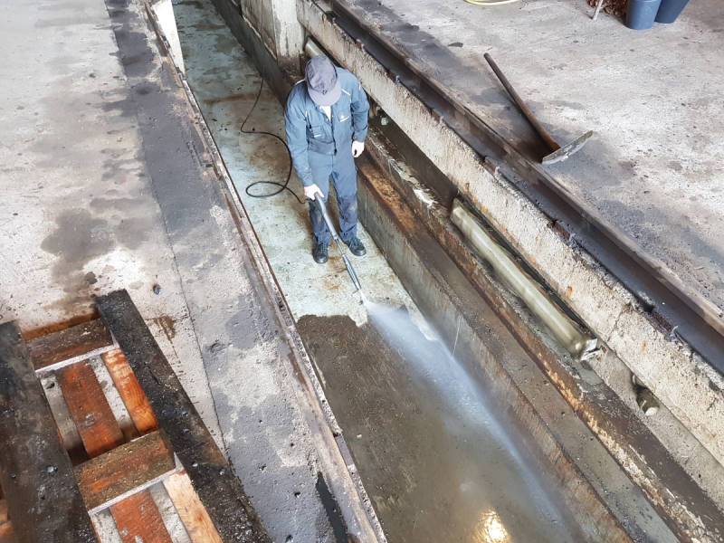 Wasser lief durch die Düse unseres Hochdruckreinigers. Ein fleißiger Kollege befreite die Untersuchungsgrube von Dreck, auf der Emma sonst steht.