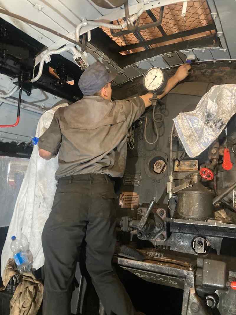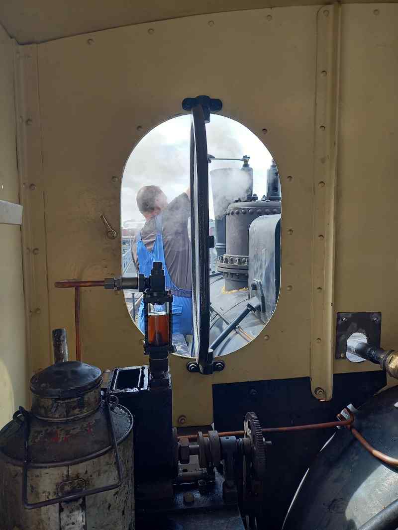 Nachdem die kleine Lok am Standort Wittenberge grundlegend überholt und mit neuen Kesselrohren ausgestattet worden war, erfolgt nun die sogenannte Warmdruckprobe. Dabei wurde der Kessel angeheizt und auf Höchstdruck gebracht um zu sehen, ob noch irgendwelche Leckagen bestanden, die einem Einsatz entgegenstehen könnten. Das war zum Glück nicht der Fall und im Beisein des Kesselprüfers konnten die Sicherheitsventile auf den zulässigen Betriebsdruck eingestellt werden. Das folgende Bild zeigt einen Blick in den Führerstand während des Anheizens. Im Vordergrund erkennt man (auf der Seite liegend) das geeichte Prüfmanometer des Kesselprüfers. Auf dem darauf folgenden Bild erkennt man, wie ein Sicherheitsventil eingestellt wird. Es muss sich in dem Augenblick automatisch öffnen, wenn der höchst zulässige Betriebsdruck überschritten wird.